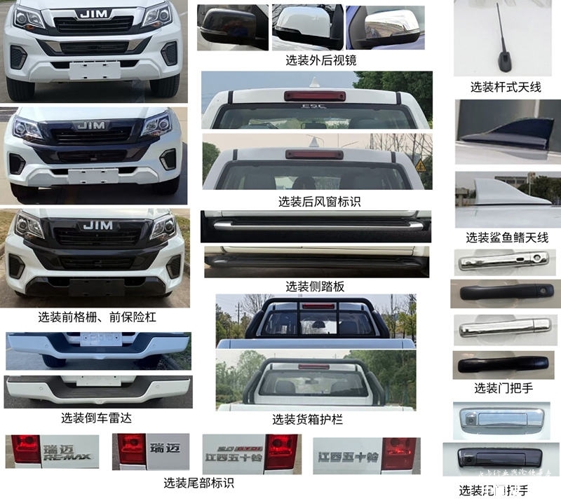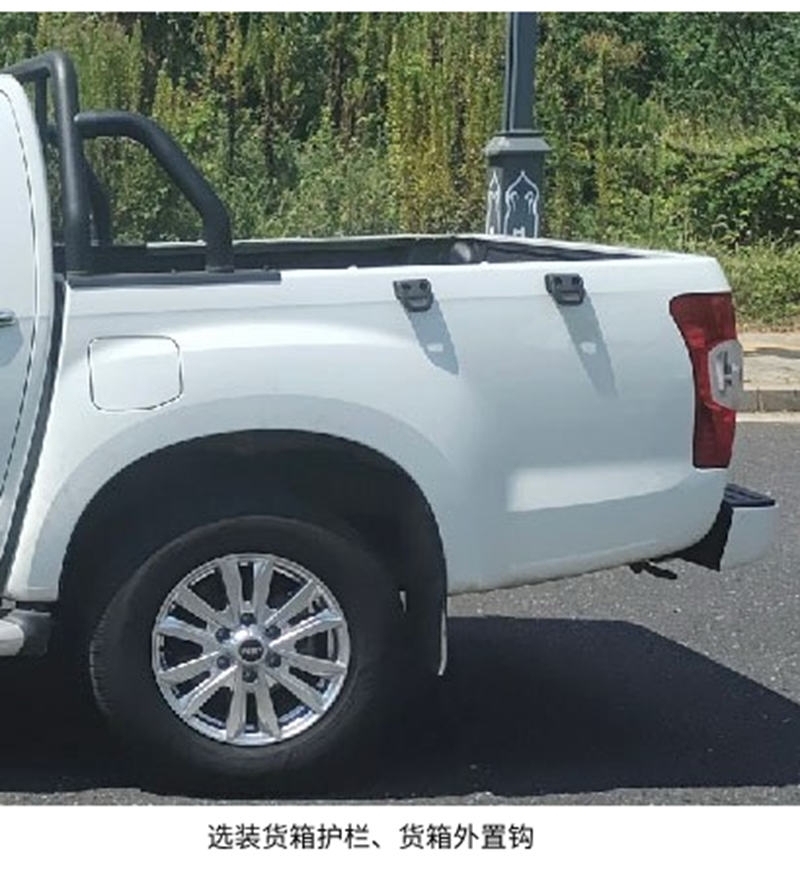 車身尺寸方面,新車軸距3095mm,長寬高為5330*1860*1775(1785,1830)mm,貨箱尺寸1480*1530*480mm,為標軸車型。額定載質(zhì)量485kg,輪胎尺寸245/70R17,后部為5片鋼板彈簧的樣式。其他配置方面,側(cè)踏板、尾部標識、天線、門把手、尾門把手、后風窗標識、倒車雷達、貨箱護欄等均為區(qū)別不同車款的配置。